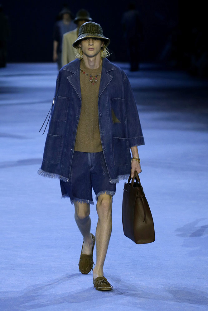 Il denim non smette di fare la sua comparsa alle sfilate. Riproposto ora come total look, il vocabolario dell’uomo si costruisce su un costante gioco di contrasti e giustapposizioni, come in casa Fendi. Un senso di libertà che non conosce età sul filo del tempo libero. Un’esplorazione illimitata di stile tra nostalgia e innovazione, per esaminare il lato classico del guardaroba maschile, fonte d’ispirazione da analizzare, decostruire, sottrarre ed elevare, da un punto di vista innovativo e artigianale. Il total look in denim si arricchisce di frange, dove gli orli sfrangiati di morbidi shorts dialogano con giacche over size. Anche chez Moschino le nuove silhouette giocano con lunghezze e altezze: i giubbotti in denim si accorciano mentre i pantaloni cargo si trasformano per abbracciare un guardaroba informale e un mix contemporaneo. Il rigorismo firmato Prada si declina in tute one piece in stretto dialogo con stivali texani dal sapore stravagante.