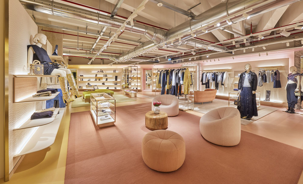 Il design resta centrale nel progetto, per esaltare la struttura architettonica originale degli anni ’30 attraverso un sistema di pareti curve che lascia a vista le travi monumentali in cemento armato. Un’immersione a 360° in grado di far restare i clienti e i visitatori a bocca aperta. Arredi vintage, design italiano, opere d’arte e oggetti d’archivio giocano con il savoir-faire artigianale e senza eguali della Maison scoprendo un’attenzione completa verso un guardaroba prezioso.