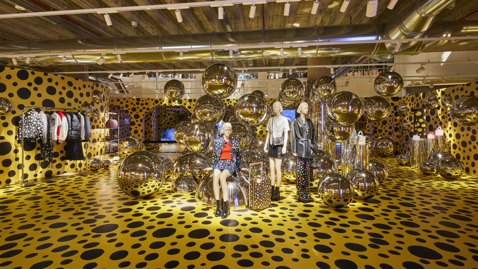 Per celebrare al massimo l’inaugurazione di questa location viene presentata al pubblico, in concomitanza con il suo lancio mondiale, la collezione Louis Vuitton x Yayoi Kusama. Tutto è a pois nell’allestimento immersivo ispirato all’arte e ai motivi ricorrenti dell’artista giapponese. Un motivo ossessivo e ripetitivo invade l’ambiente e contamina tutte le superfici offrendo ai visitatori un’esperienza unica e distopica. Il motivo Infinity Dots a pois giallo e nero e le Metal Ball, le maxi sfere in metallo su cui si riflette lo spazio, si moltiplicano all’infinito trasformando lo spazio in luogo dove perdersi.
