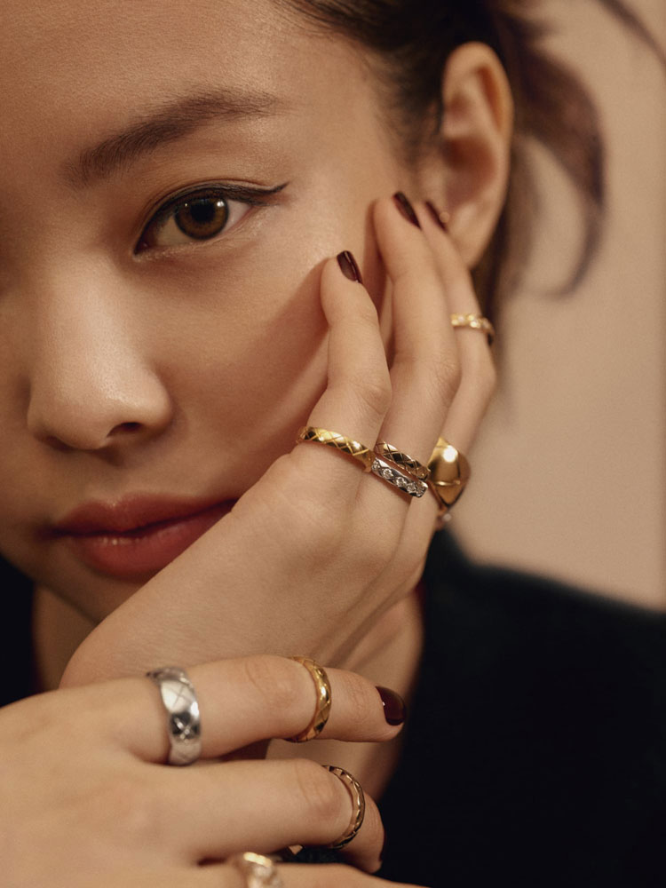 Collana Chanel Coco Crush con pattern trapuntato in oro Beige e diamanti. Jennie, cantante coreana e Chanel ambassador, indossa alcuni modelli della nuova collezione Coco Crush 2022.