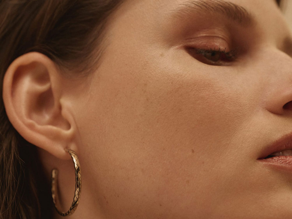 La lettera C, protagonista di una collana disponibile nelle tre varianti dell’oro che monta al centro un diamante taglio rotondo, presta la sua silhouette anche su un paio di orecchini a cerchio “creoles” dove il pattern trapuntato adorna con leggerezza il profilo del volto.