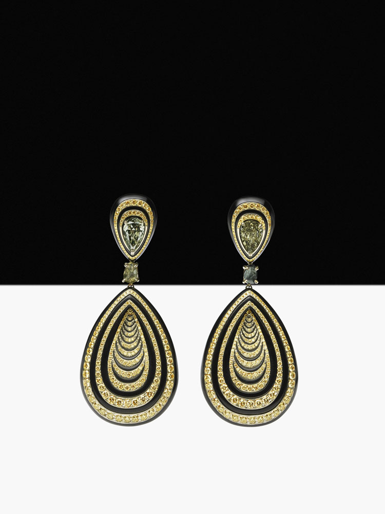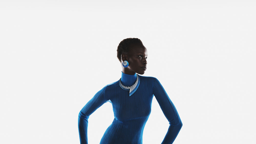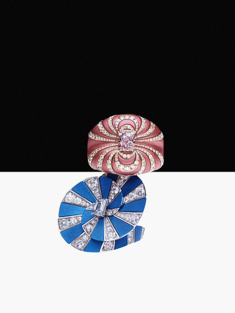 Anche l’arte rientra tra le ispirazioni della nuova collezione Alchemist of Light. Geometrie, rifrazioni, cinetismo e vibrazioni dominano i gioielli intitolati Optical Wonder, ispirati alle opere di Victor Vasarely. Proprio come nei quadri dell’artista ungherese fondatore della Op Art, alcuni esemplari sono monocromatici, mentre altri si animano di cromie vivaci. Tutti i gioielli della parure sono interamente votati a creare effetti illusori, proiettando fasci di luce riflessa e rifratta attraverso linee e profili audaci.