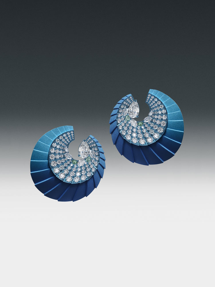 La Parure Ascending Shadows è composta da sette esemplari che richiamano nel proprio volume e design la scala a chiocciola nel nuovo flagship store di De Beers Jewellers in Old Bond Street, Londra. La collana in alluminio blu scuro monta al centro un diamante a goccia grigio chiaro fantasia da 3,41 carati.