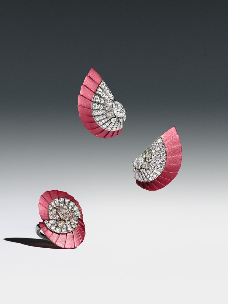 Sono 45 gli esemplari unici della collezione che raccontano nel linguaggio prezioso il momento in cui la luce del sole si irradia nel cielo mattutino. Per concepire tutte le sue sfumature la direttrice creativa ha scelto metalli ultraleggeri e contemporanei come il titanio anodizzato rosa, blu e verde e l’alluminio; mentre per l’oro rosa e bianco è la finitura radiale satinata a conferire un effetto spazzolato che esalta la luminosità.