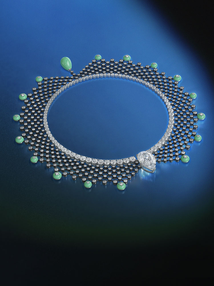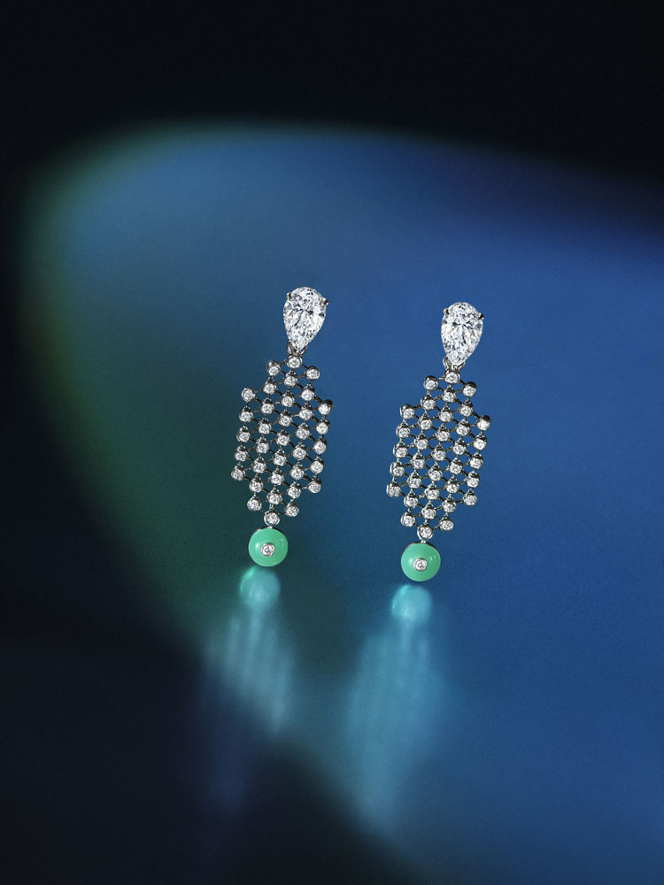 Oltre ai diamanti bianchi, i diamanti fancy e alcuni diamanti grezzi – splendidi per la loro particolare allure naturale – troviamo il crisoprasio come protagonista dei gioielli appartenenti alla parure Midnight Aura. De Beers Jewellers ha individuato tra tante pietre di colore ornamentali questa particolare variante di calcedonio color verde mela in grado di rappresentare la tonalità delle nuvole di polvere di stelle. Di provenienza africana con le sue note fresche e variopinte è stato abbinato ai diamanti in taglio princess, a goccia e brillante.