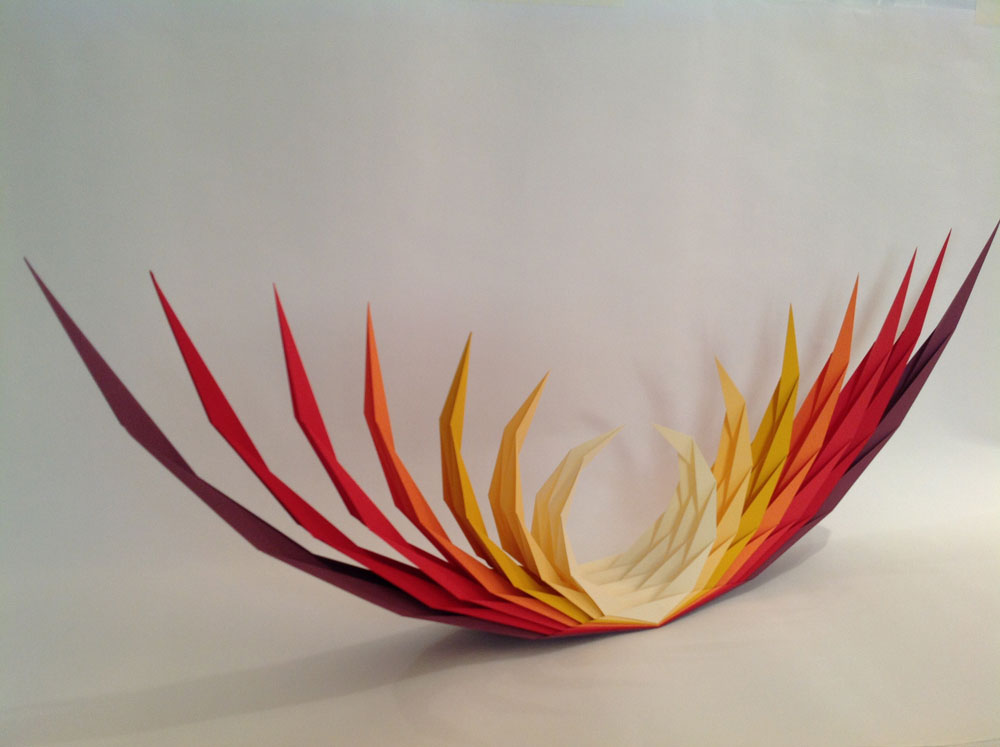 Scultura origami “Composizione in rosso”. L’atelier Origami-Do di Luisa Canovi lavora nel rispetto del diritto d’autore e preferibilmente crea modelli nuovi per ogni singola richiesta del committente.