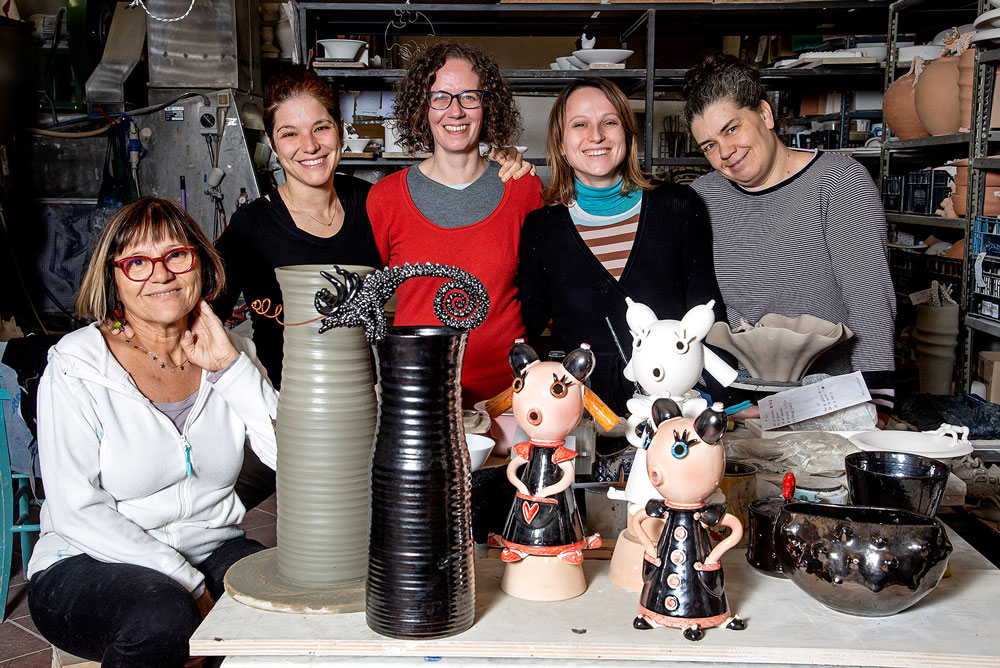 La Maestra d’Arte Mirta Morigi (a sinistra) e le talentuose artigiane che con passione lavorano nella bottega che porta il suo nome. A Faenza, il “fare bottega” si basa su un connubio di creatività e di tecniche che racconta l’unicità dell’essere artigiani. Foto di Federica Cioccoloni