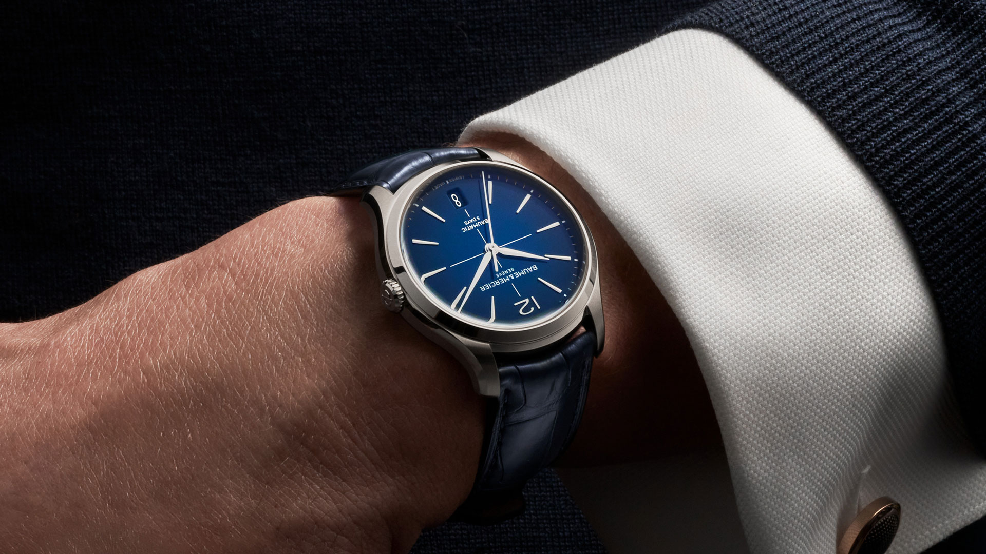 Baume & Mercier Clifton Baumatic – Ref. 10771 – cassa tonda in acciaio, diametro 39 mm, spessore 11,22 mm – fondello con vetro zaffiro – impermeabilità fino a 50 metri – quadrante blu sfumato con finitura laccata, indici a trapezio, lancette ore e minuti alfa, datario al 6 – movimento meccanico a carica automatica Baumatic calibro BM13-1975 A, 5 giorni di riserva carica (120 ore). Funzioni: ore, minuti, secondi, data – cinturino intercambiabile in pelle di alligatore blu, tripla fibbia pieghevole con pulsanti di sicurezza. Prezzo al pubblico: 3.550 euro.