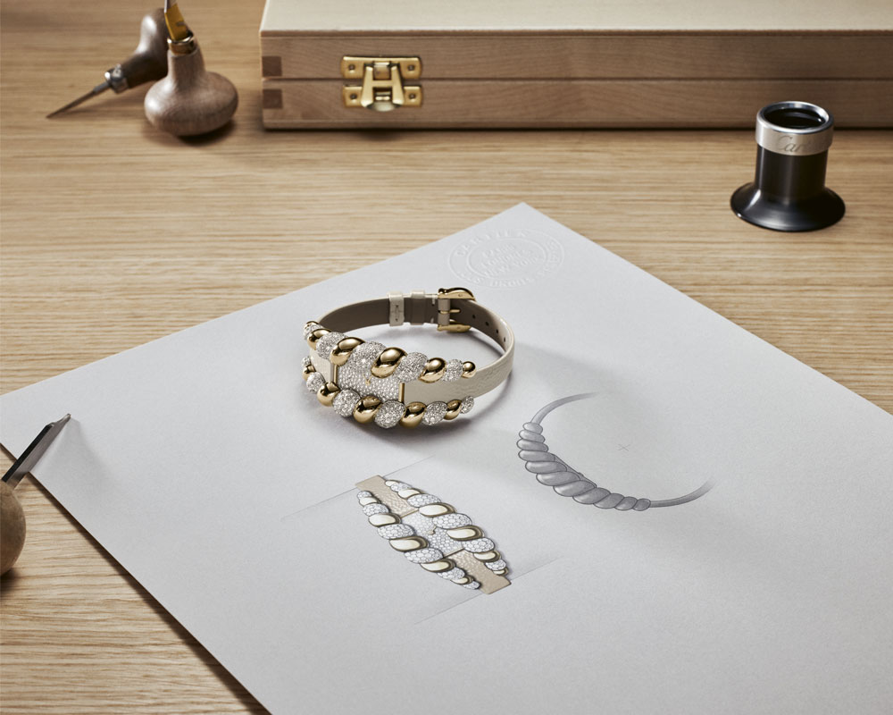 Creativo e raffinato, l’orologio si inserisce nel solco tracciato da creazioni come Maillon, Coussin e Reflection de Cartier: attraverso un sofisticato gioco di contrasti e armonie tra oro, pietre preziose, volumi insoliti e opposizioni materiche, la Maison dà vita a una vera e propria scultura da indossare al polso che unisce in modo armonioso solidità architettonica e movimento, elementi distintivi dello stile Cartier.