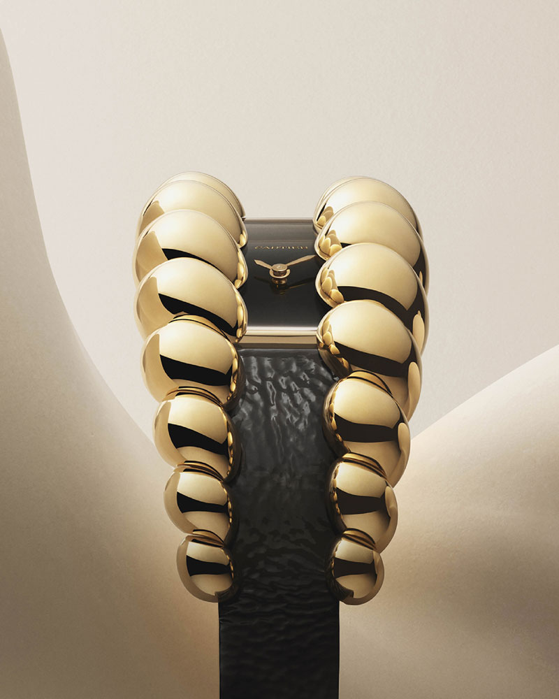 Come un vero e proprio bracciale di alta gioielleria, l’orologio segue il polso con la sua elegante curvatura.