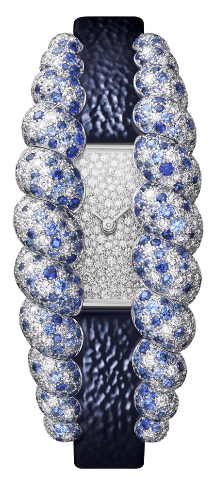 Due interpretazioni scelgono infine di vestirsi d’oro bianco per la cassa e il bracciale, compresa la fibbia ad ardiglione, e lo fanno sfoggiando una sontuosa incastonatura di pietre preziose luminosissime e splendenti. Ben 916 diamanti taglio brillante (12,2 carati), con quadrante in oro bianco ornato di 156 diamanti taglio brillante (0,6 carati), cinturino in pelle liscia blu navy e secondo cinturino in pelle lucida nera la prima declinazione. 570 diamanti taglio brillante (5,7 carati) e 330 zaffiri (5,9 carati), con quadrante in oro bianco rivestito di 156 diamanti taglio brillante (0,6 carati), primo cinturino in pelle lucida blu navy e secondo cinturino in pelle liscia blu navy, per l’altra, più colorata e sofisticata grazie alle pietre blu che donano un tocco ricercato.